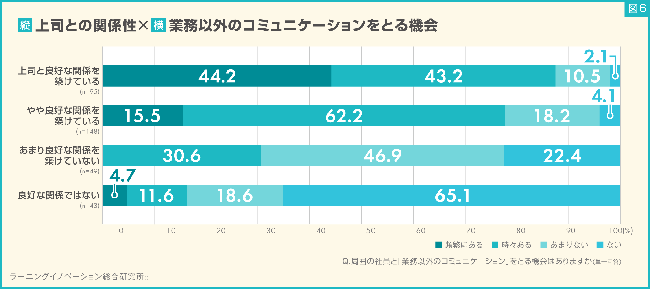 一方、上司と「良好な関係ではない」と回答した若手社員のうち、65.1%が周囲の先輩と業務以外のコミュニケーションをとることが「ない」と回答しました(図6)。
