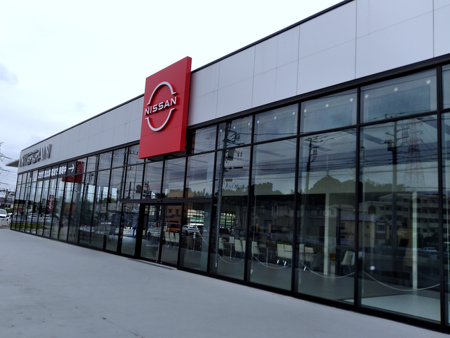 日産神奈川販売株式会社 R1東戸塚店のガラス上部に設置した太陽電池