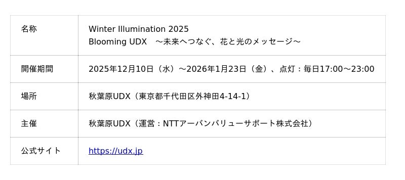 また、営業終了にともない、20年間のご愛顧に感謝の気持ちを込めて、2025年12月10日(水)より「Winter Illumination 2025」を開催します。今年のイルミネーションのテーマは「Blooming UDX~未来へつなぐ、花と光のメッセージ~」。花と光が織りなす幻想のひとときをお楽しみいただくとともに、“過去から未来へ”とつながるストーリーを、咲き誇る花々で表現します。竣工から現在にいたるまでの思い出の写真の展示にくわえ、AKIBA_ICHIご利用のお客さまへ景品やお花のプレゼントを実施します。