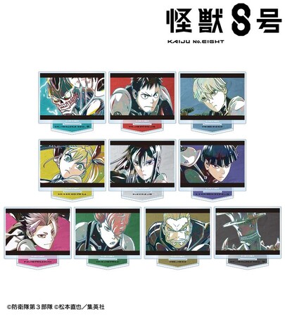 怪獣8号、日比野カフカ、市川レノ、四ノ宮キコル、亜白ミナ、保科宗四郎、鳴海弦、古橋伊春、四ノ宮功、怪獣9号のイラストを新たなタッチで魅力的に表現し、アクリルスタンドに仕上げました。