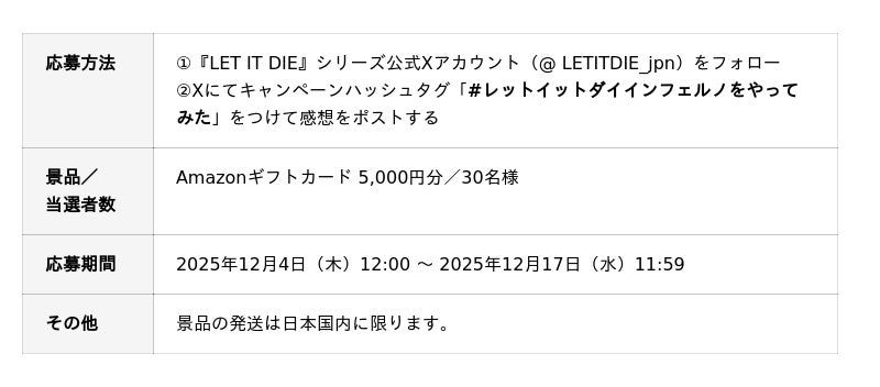 本作の発売を記念して、『LET IT DIE』シリーズ公式Xアカウントにて「発売記念リポストキャンペーン」を実施中です。本キャンペーンでは、抽選で30名様にAmazonギフトカード 10,000円分が当たります。リポストするだけの簡単応募ですので、皆様ぜひお気軽にご参加ください。[画像5: https://prcdn.freetls.fastly.net/release_image/25063/2041/25063-2041-8bdb62ffbe4e57de65e09b0af5b47bfe-800x800.jpg?width=536&quality=85%2C75&format=jpeg&auto=webp&fit=bounds&bg-color=fff ]