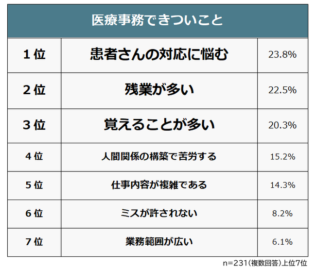 医療事務をしたことがある231人に「医療事務できついと感じること」を聞いたところ、1位は「患者さんの対応に悩む(23.8%)」でした。2位「残業が多い(22.5%)」、3位「覚えることが多い(20.3%)」が続きます。