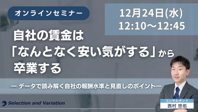 組織・人事コンサルティングファームであるセレクションアンドバリエーション株式会社(以下、当社、東京都千代田区丸の内、大阪市西区、名古屋市西区 / 代表取締役社長:平康慶浩/ URL:https://sele-vari.co.jp/ )は『自社の賃金は「なんとなく安い気がする」から卒業する ― データで読み解く自社の報酬水準と見直しのポイント―』セミナーを2025年12月24日(水)12:10~12:45に開催することをお知らせいたします。