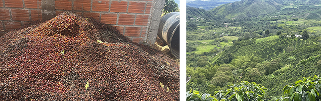 画像提供:コンサベーション・インターナショナル (左)コロンビア・ウイラ地区におけるコーヒー豆の生産残渣((C) Fundecafe) (右)コロンビア・ウイラ地区のコーヒー農園((C) コンサベーション・インターナショナル)