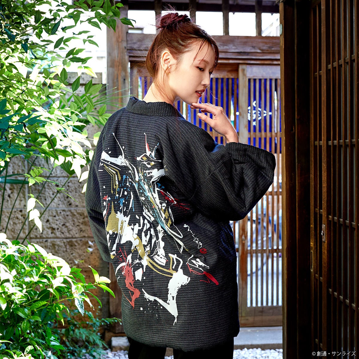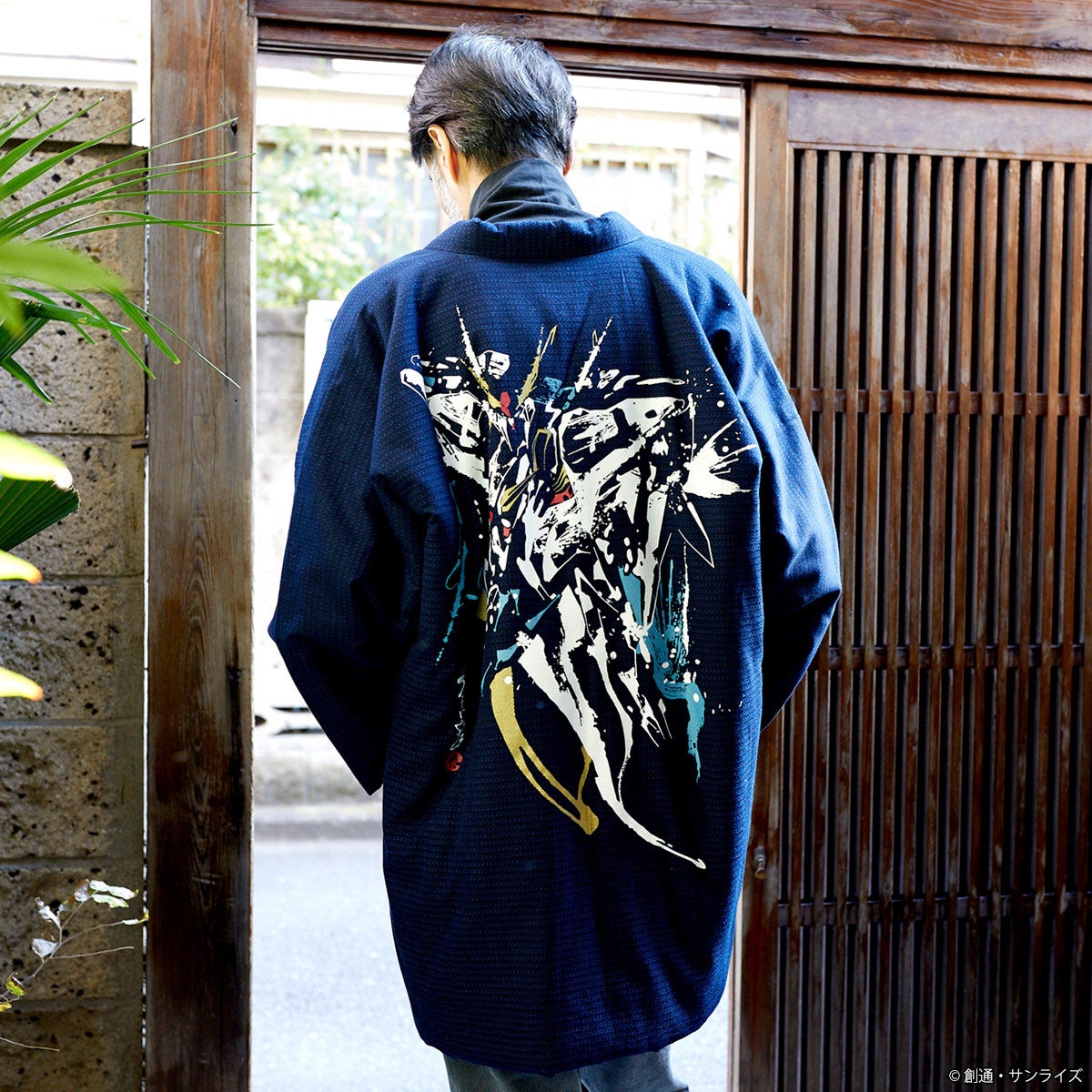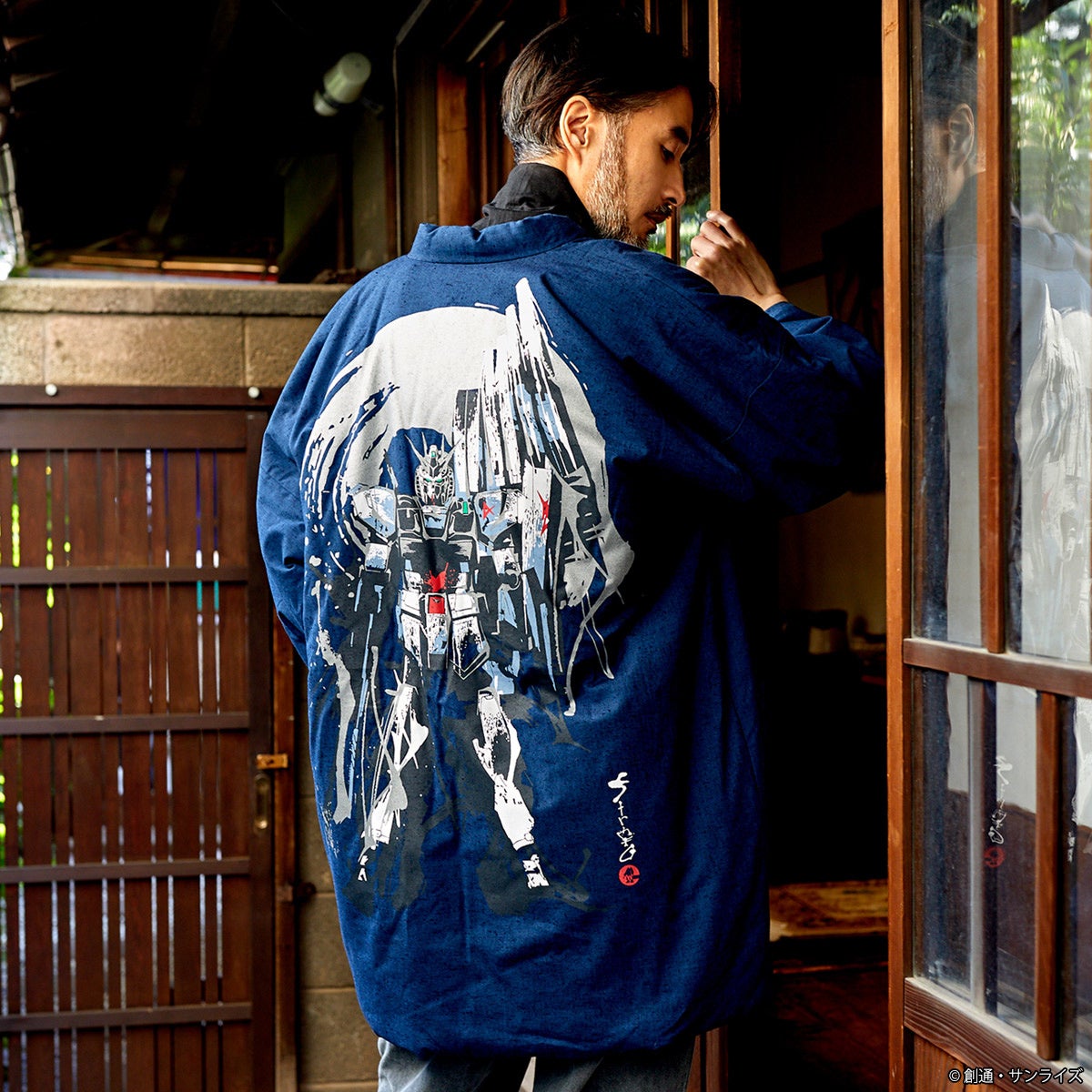 素材・色・形をちょっとモダンに仕立てた半纏は、長年続いたわた入れ半纏の型を見直し、袖下をカットした上品でレトロな印象のモデル。織りから国内自社で行ない、綿を入れ、とじる作業まで手作業で一枚一枚丁寧に行なわれた一着です。背中には躍動感の有る筆絵タッチで、『機動戦士ガンダム 逆襲のシャア』から、νガンダムとサザビー、『機動戦士ガンダム 閃光のハサウェイ キルケーの魔女』からは、Ξ(クスィー)ガンダムとペーネロペーの全4種展開、和のテイストを表現したインパクトの有るデザインです。又、大きいサイズの半纏をお探しの方に、2L~3Lサイズ程度のロングサイズもご用意しています。