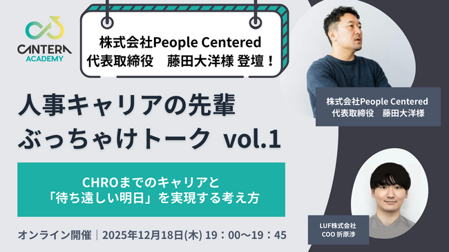 LUF株式会社(本社:東京都港区、代表取締役:堀尾 司)は、は、株式会社People Centered 代表取締役の藤田 大洋 氏をゲストにお招きし、オンライントークイベント「人事キャリアの先輩 ぶっちゃけトーク vol1 ~CHROまでのキャリアと「待ち遠しい明日」を実現する考え方~」を2025年12月18日(木)に開催いたします。