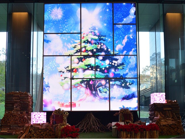 イベント当日、園児たちの魔法の掛け声によってLEDパネルツリーが鮮やかに点灯すると、大歓声とともに会場全体が幻想的な光に包まれました。その後、館内に響き渡る園児たちの「ジングルベル」の大合唱が行われ、ツリーのパネルには、両社で企画・制作した「クリスマスファンタジー」をテーマにしたオリジナルアニメーションが映し出されました。光と映像が融合したダイナミックな演出は、来場された方々を魅了し、会場は笑顔であふれ、子どもたちにとって特別な一日となりました。