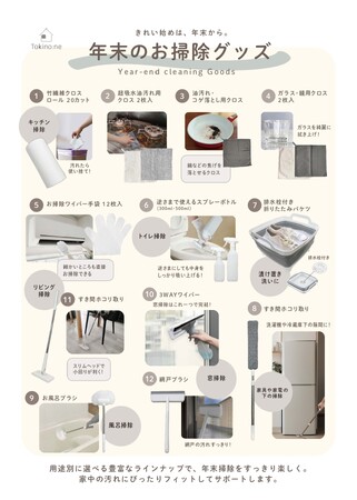 100円ショップや雑貨店など全国1,900店舗以上を運営する株式会社ワッツ(本社:大阪府大阪市中央区、代表取締役:平岡史生)が運営するファッション雑貨ブランド「Tokino:ne(ときのね)」は、年末の大掃除シーズンに合わせ、時短・省力化をサポートする“お掃除グッズシリーズ”を2025年12月3日(水)より全国の一部ワッツ店舗にて発売いたしました。また、12月5日(金)よりオンラインショップでも販売を開始いたします。
