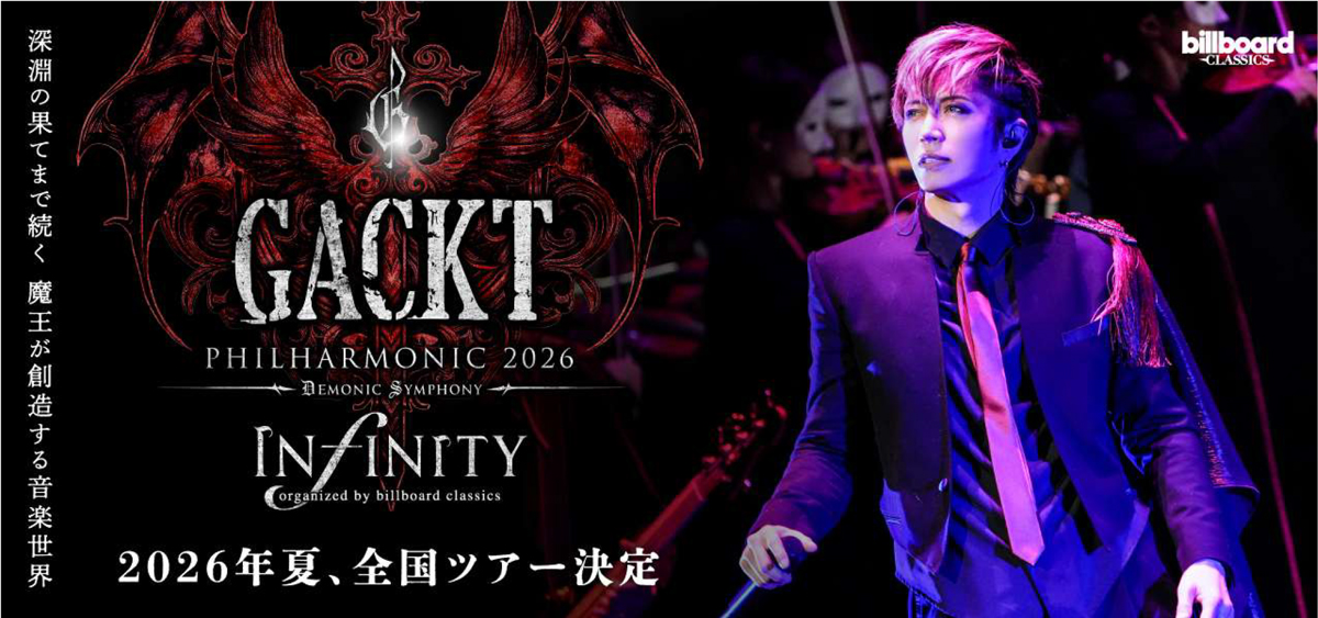 ビルボードジャパン(株式会社阪神コンテンツリンク)は、全国8都市を巡るGACKTのフルオーケストラツアー【GACKT 魔王シンフォニー 2026 -INFINITY- organized by billboard classics】の開催を決定した。