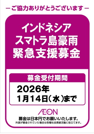 また、イオンのグループ主要企業各社が税引き前利益の1%を拠出している公益財団法人イオンワンパーセントクラブにおいて、インドネシアへの緊急支援金として、50,000USDを寄付する予定です。