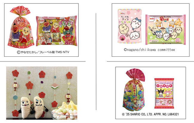 栗山米菓のひなまつりシリーズは、長年愛され続ける定番商品に加え、トレンド感あるキャラクター を取り入れた豊富なラインナップが特徴です。「それいけ!アンパンマン」、「サンリオキャラクターズ」、「ちいかわ」とのコラボ商品をラインナップしました。