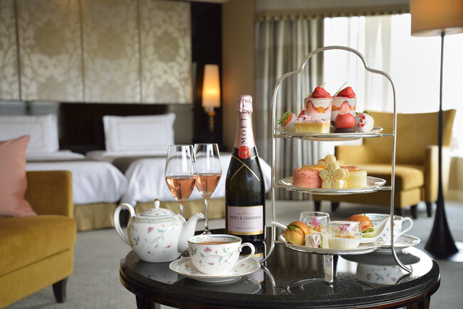 桜咲く庭園を眼下に、ホテルに1室だけの特別なスイートルームでアフタヌーンティーを。桜香る泡風呂で、シャンパンを傾けるのも一興です。窓から、また庭園内では早咲きのものから順に開花する桜のお花見をお楽しみください。