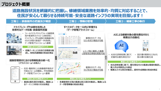 今後は、愛知県からの実証費用の支援に加え、実施に向けた助言や進捗管理などのサポートを受けながら、自治体と連携して実証実験に取り組むことで、道路維持管理業務の効率化・高度化を図り、地域課題の早期解決を目指します。