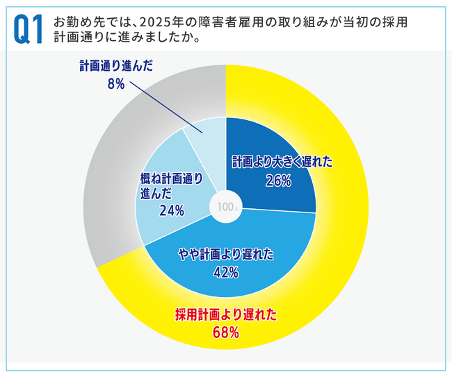 2025年の障害者雇用の取り組みが採用計画通りに進んだかを伺うと約7割が「遅れた」と回答し、計画通りに進んだ企業は32%にとどまりました。