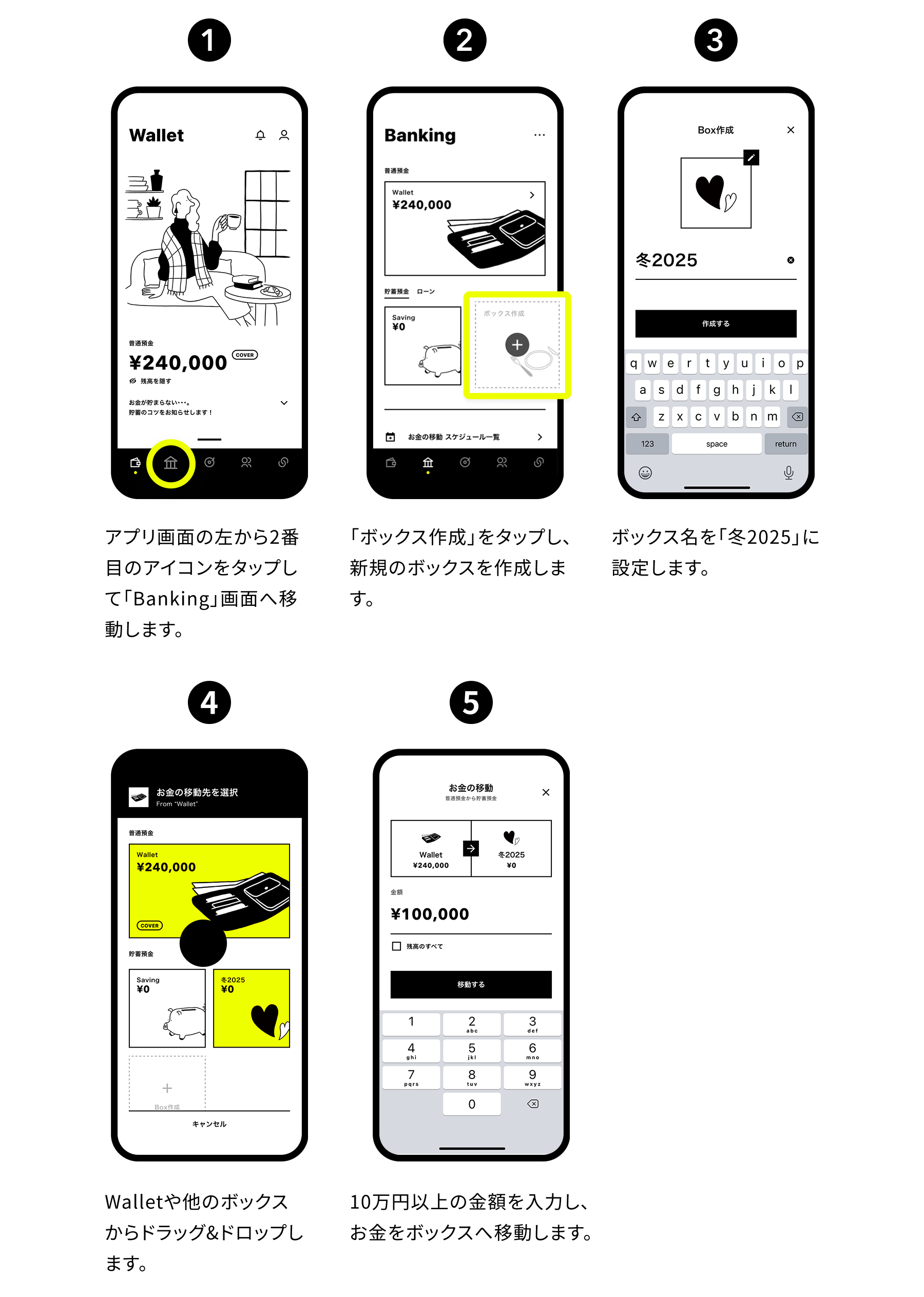2025年12月8日から2026年1月15日までの期間(条件達成期間)中に、1.みんなの銀行預金残高(普通預金と貯蓄預金の合計)を10万円以上増やし、かつ、2.新たに「冬2025」の名称のボックス(貯蓄預金)を作成して10万円以上を入金した方で、3.2026年1月15日から2026年4月15日までの期間(条件キープ期間)中、「冬2025」ボックスの残高を10万円以上キープしていただいた方に、もれなく現金1,000円をプレゼントします。