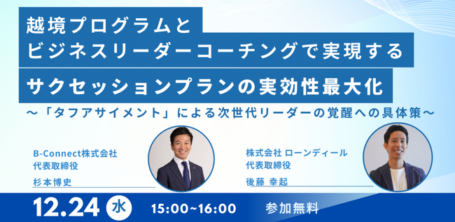 ビジネスコーチ株式会社(本社:東京都港区、代表取締役社長:細川 馨、東証グロース:9562)の子会社であるB-Connect株式会社(本社:東京都港区、代表取締役社長:杉本 博史、以下当社)は、12月24日(水)に、株式会社ローンディール 代表取締役 後藤幸起氏をお招きし特別セミナーを開催いたします。両社のソリューションを組み合わせることで、サクセッションプランの実効性を最大化させる具体策をお伝えいたします。