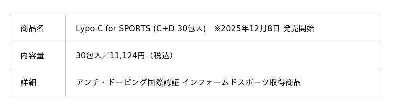 このたび、リポ・カプセル ビタミンCに続き、リポ・カプセル ビタミンC+Dも国際的アンチドーピング認証であるインフォームドスポーツを取得し、「Lypo-C for SPORTS(C+D 30包入)」として、2025年12月8日(月)12:00より販売を開始いたしました。