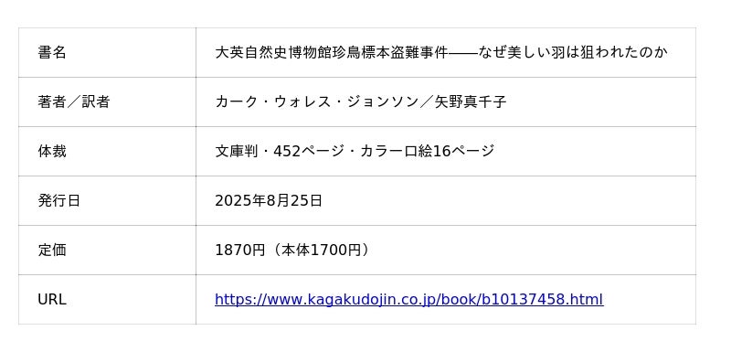 株式会社化学同人(本社:京都市下京区、代表取締役社長:曽根 良介)より2025年8月に刊行した、『大英自然史博物館珍鳥標本盗難事件』(DOJIN文庫)が「本の雑誌が選ぶ2025年度文庫ベストテン」の第1位に選出されました。