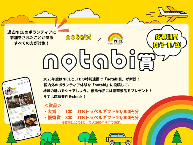 「notabi賞」株式会社JTB(本社:東京都品川区、代表取締役 社長執行役員 山北栄二郎)が運営する旅行記録アプリ「notabi(のたび)」と連携し、国内外のボランティア活動体験を「旅の記録」として共有する新たな取り組みを開始します。