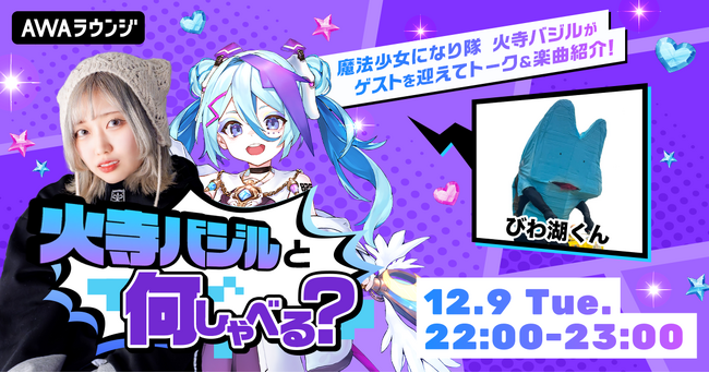 AWA株式会社(本社:東京都港区、代表取締役CEO:冨樫晃己)が運営する、サブスクリプション型(定額制)音楽ストリーミングサービス「AWA(アワ)」は、2025年12月9日22:00~23:00の1時間に渡り、無料で誰でも参加できるオンライン空間「AWAラウンジ」で、ロックバンド「魔法少女になり隊」のボーカルでアパレルブランドのプロデュースやVTuber配信などマルチに活動する火寺バジルがMCを務めるAWAラウンジ公式番組「火寺バジルと何しゃべる?」の第4回を開催いたします。