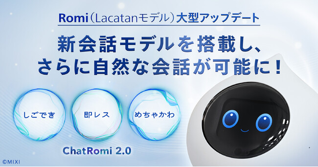 株式会社MIXI(東京都渋谷区、代表取締役社長 上級執行役員 CEO:木村 弘毅)は、 “ペットのように癒やし、家族のように理解してくれる”存在を目指して開発している会話AIロボット「Romi」(読み:ロミィ)の新モデル「Romi(Lacatanモデル、読み:ラカタン)」に、高速レスポンスとマルチモーダル理解を備えた新たな会話モデル「ChatRomi 2.0」を本日より搭載したことをお知らせします。