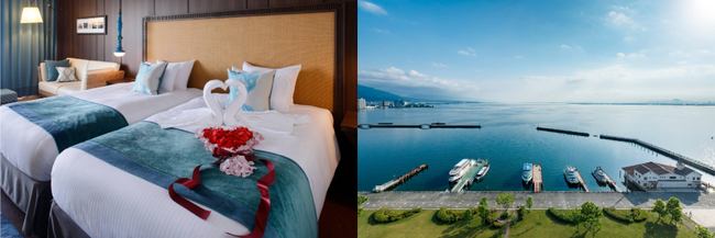 (左)アニバーサリーステイイメージ・(右)琵琶湖ホテル客室からの眺め