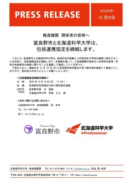 2025年12月15日(月)、北海道富良野市と北海道科学大学は、包括連携協定の締結式を実施します。