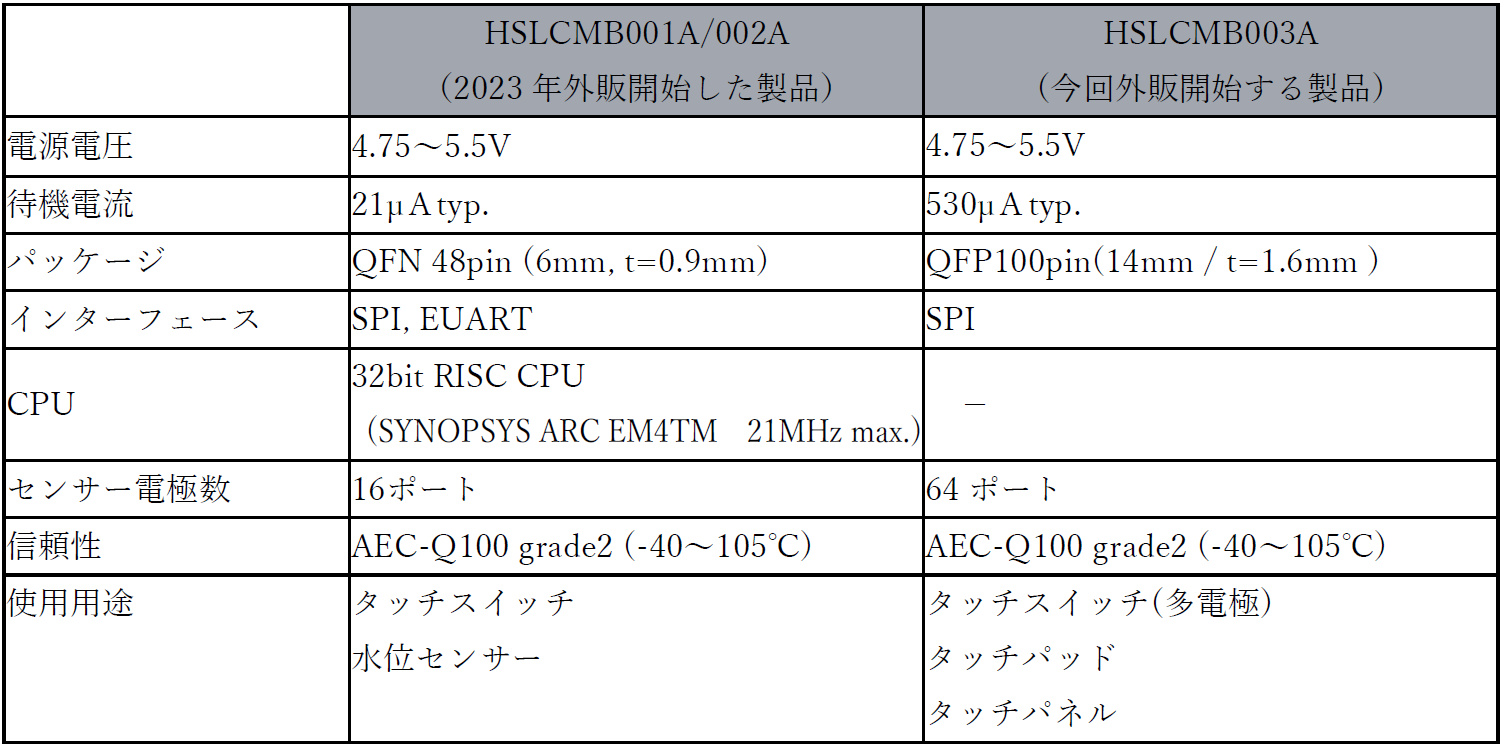 この度、外販を開始する「HSLCMB003A」は、2023年に外販を開始した「HSLCMB001A/002A」と比較し、センサー電極数が16ポートから64ポートに増えたことで、多電極を要する用途、特にタッチパネルやタッチパッドに最適なICです。