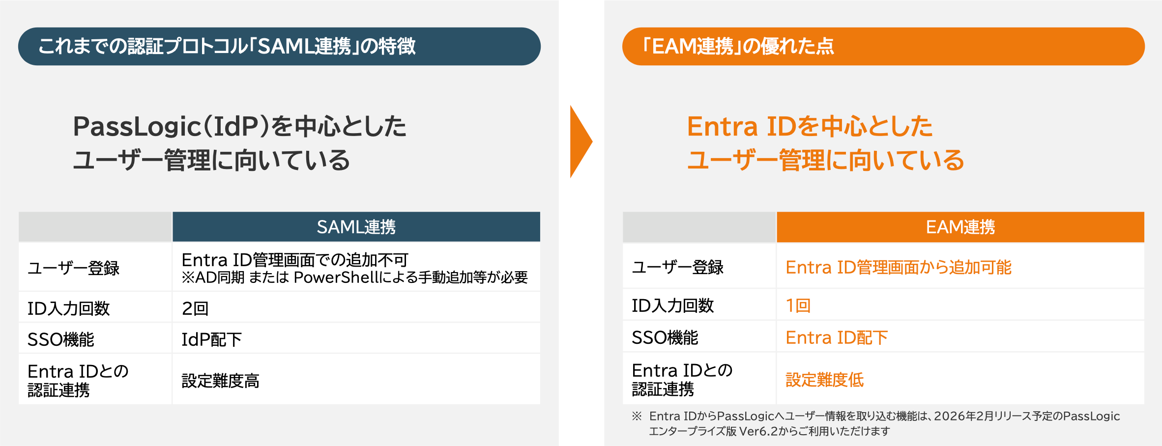 SAML連携で発生していたユーザー管理の煩雑さを改善従来のSAML連携では、Microsoft 365を利用するために自社ドメインを設定し、PassLogicとEntra IDの双方でユーザー情報を整合させる必要があり、AD同期やPowerShellによるユーザー追加など、運用が複雑になりがちでした。