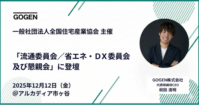 不動産売買支援ハブ「レリーズプラットフォーム」の開発・提供をするGOGEN株式会社(本社:東京都港区)の代表取締役CEO:和田 浩明が、2025年12月12日(金)に開催される一般社団法人全国住宅産業協会の「流通委員会/省エネ・DX委員会及び懇親会」にて講師を務めます。