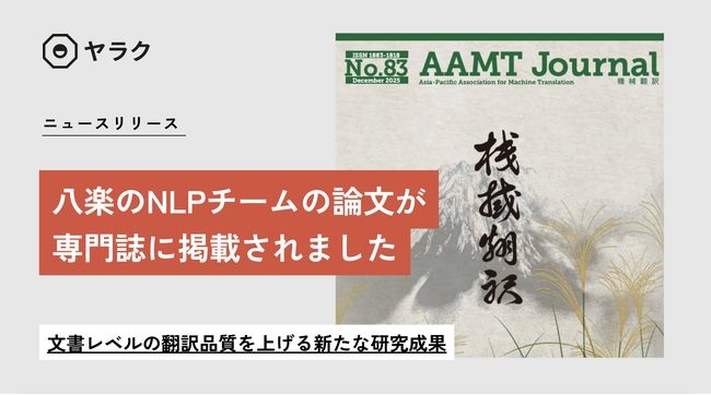 生成AIを搭載した翻訳支援ツール(CATツール※)「ヤラク翻訳」を提供する八楽株式会社(本社:東京都渋谷区、代表取締役:坂西 優、以下八楽)は、八楽の自然言語処理チームが執筆した研究論文が、国内の歴史ある“機械翻訳専門”の学術誌「機械翻訳」(発行:アジア太平洋機械翻訳協会=AAMT)に掲載されたことをお知らせいたします。