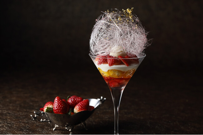 1・2月に登場する『大人のいちごパフェ』は、いちご本来の香りと瑞々しさを閉じ込めたジュレをベースに、フレッシュないちご、優雅な白ワイン風味の金柑のコンポートを重ねた、冬ならではの華やかな一品です。中央にはバニラアイス、仕上げには繊細にきらめく飴細工と金箔を纏わせました。主役であるいちごの可憐さが際立つ、冬にふさわしい上質なパフェです。