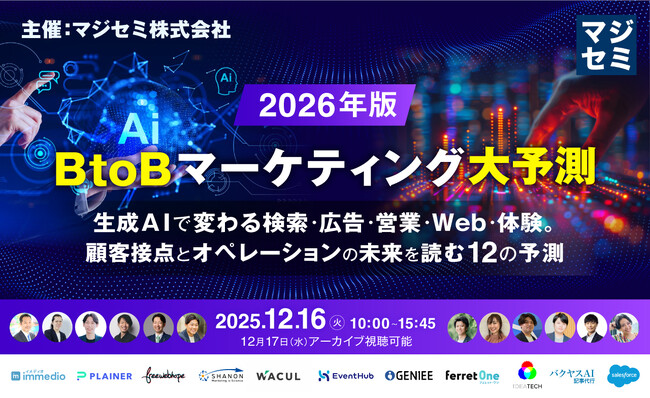 ファクトに基づいたコンテンツ開発とマーケティング支援を行う、株式会社IDEATECH(本社:東京都港区、代表取締役社長:石川友夫、以下 IDEATECH)は、マジセミ株式会社(本社:東京都渋谷区、代表取締役:寺田 雄一)主催のオンラインセミナー「2026年、BtoBマーケティング大予測 ~生成AIで変わる検索・広告・営業・Web・体験。顧客接点とオペレーションの未来を読む12の予測~」に登壇いたします。