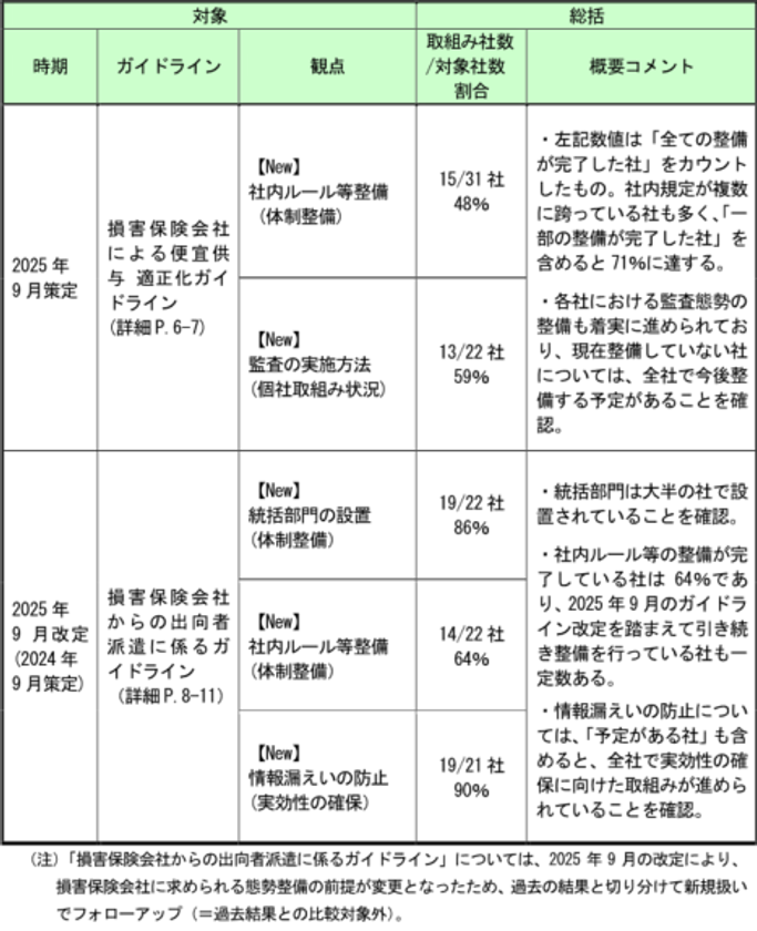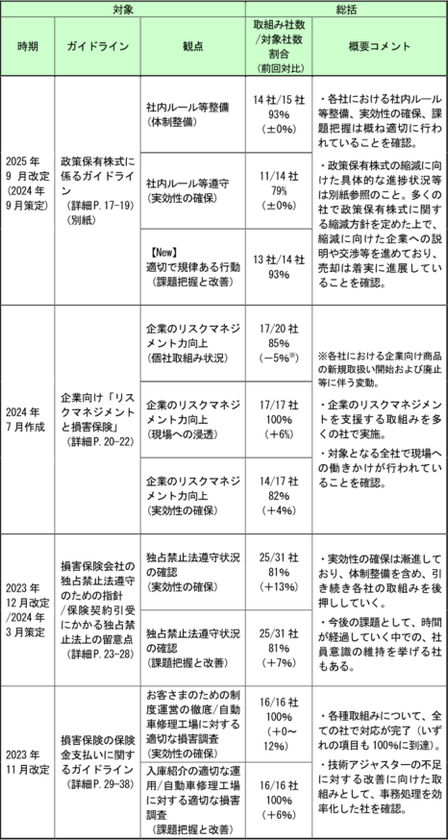 一般社団法人 日本損害保険協会(会長:舩曵 真一郎)では、「顧客本位の業務運営の徹底」および「健全な競争環境の実現」のために、2025年11月に、第3回となるガイドライン等を踏まえた会員会社の取組みのフォローアップを行いましたので、結果を公表します。