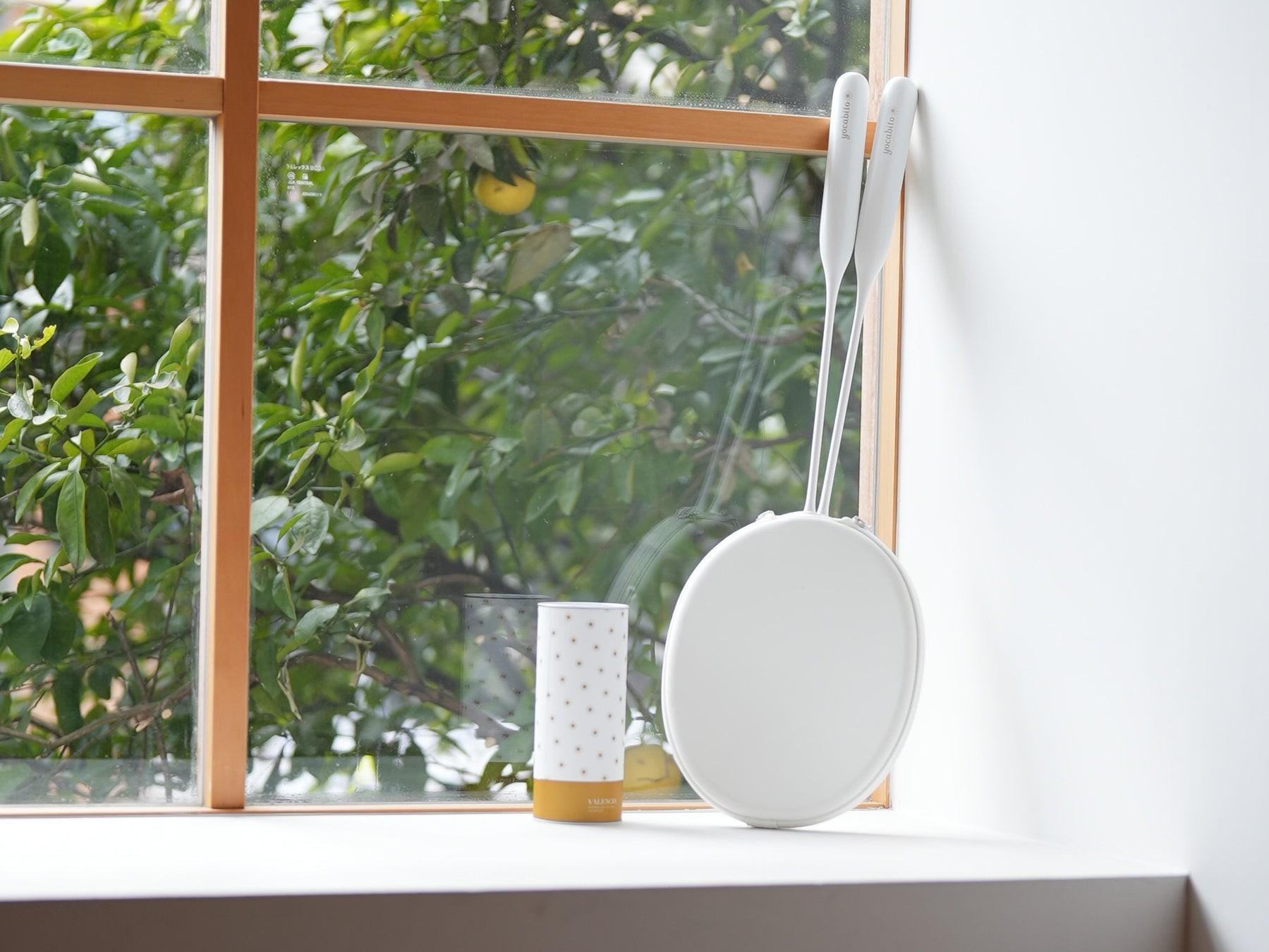 箱を開けた瞬間に心が躍る、白×オレンジの美しいデザイン。こだわりの握り心地で、手に取るたびに高揚感を感じられます。使わない時は玄関やリビングの棚に飾っておけるインテリア性の高さも、ギフトとして喜ばれるポイントです。