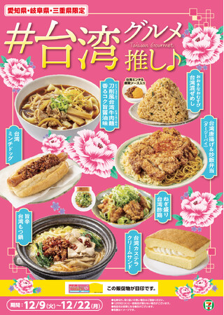 株式会社セブン₋イレブン・ジャパン(本社:東京都千代田区、代表取締役社長:阿久津 知洋)は、12月9日(火)~22日(月)の期間、愛知県・岐阜県・三重県の東海3県限定で「#台湾グルメ推し♪フェア」を開催します。