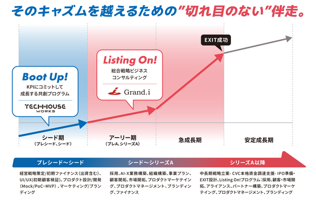 そこで、シード期~アーリー期の支援に強みを持つTechHouse.Works株式会社、アーリー期以降の支援に強みを持つGrand.i株式会社がタッグを組み、この課題解決に挑戦します。