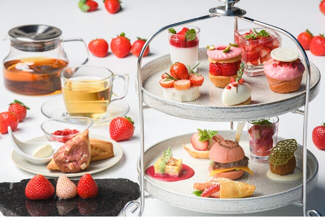 今年の『苺のアフタヌーンティー』は、赤と白を基調にした華やかなスイーツをご用意。旬の苺を使ったスイーツ、フランス料理のコンクールで日本一に選ばれたシェフが手掛けるセイボリー、プレミアムな一粒を堪能できる食べ比べ苺、人気の焼き立てスコーン、そして期間限定のフレーバーティーなどのドリンクが揃う贅沢なセットメニューです。