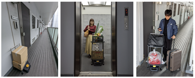 左:各部屋への宅配物の搬送 / 中:エレベーターと連携し、ロボットが住人の買い物荷物を部屋まで自律搬送 / 右:各部屋からロビーへの荷物運搬(ゴミ出しや旅行バック等)をサポート