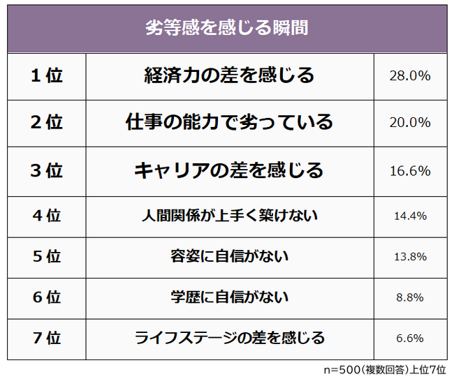 社会人の男女500人に「劣等感を感じる瞬間」を聞いたところ、1位は「経済力の差を感じる(28.0%)」でした。2位「仕事の能力で劣っている(20.0%)」と答えた人も2割以上、次いで3位「キャリアの差を感じる(16.6%)」となっています。