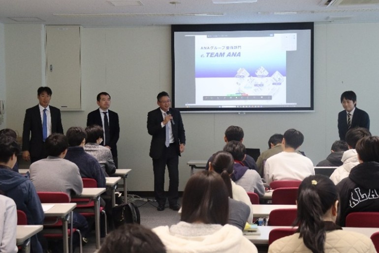 本プログラムでは、12月3日にe.TEAM ANAの採用を統括するANA整備センター教育訓練部をはじめ、4名の社員が岡山理科大学岡山キャンパスを訪れて説明会を開催。46人の参加学生(1~4年生、大学院生)を前に、航空機整備の仕事やグループ整備部門7社の業務内容、また、航空機整備以外の多種多様なANAグループの職業(例:空港地上支援、フライトケータリング、貨物・物流、調査研究・シンクタンク、IT、セールス&マーケティング、総合商社、不動産・保険・ビルメンテナンス、人材・ビジネスサポートなど)について紹介があり、その後12月17日(水)に行うプレゼンテーションの「テーマ」が示されました。