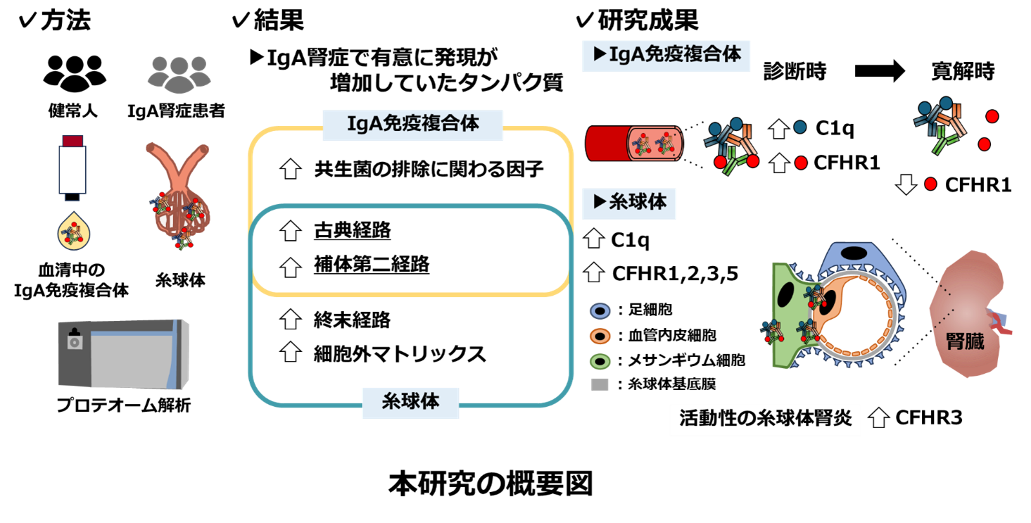 IgA腎症は日本を含むアジア地域に多く発症する腎炎で、血中に形成されるIgAを含む免疫複合体が腎臓のろ過器である糸球体に沈着して炎症を引き起こします。自覚症状に乏しく主に健康診断で血尿や蛋白尿を指摘され、腎生検で確定診断されますが、無治療では多くが腎不全に至る疾患です。これまで、血中の病的なIgA免疫複合体の存在や補体系の関与が示唆されてきましたが、血中のIgA免疫複合体と糸球体内に含まれるタンパク質を網羅的に比較し、共通する分子を同定する研究はありませんでした。特に、病的IgA免疫複合体に含まれるタンパク質が治療によってどのように変化するかは十分に解明されておりません。本研究は、これらのギャップを埋め、新たな診断法や治療法の開発にむけてIgA腎症の病態の分子基盤を明らかにすることを目的としました。