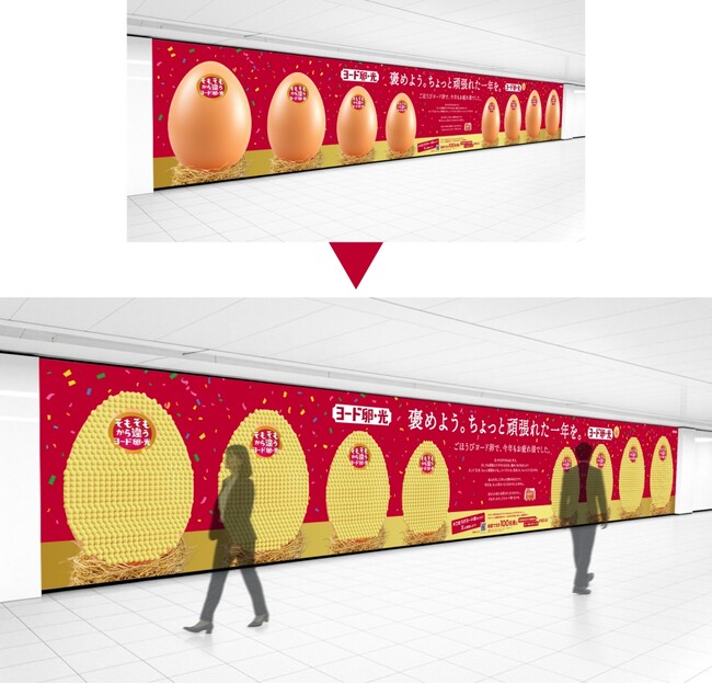 「今年一年で自分を褒めたいこと」を貼ることで新宿に金の卵が完成!Qoilが「ヨード卵・光」の体験型広告をプロデュース