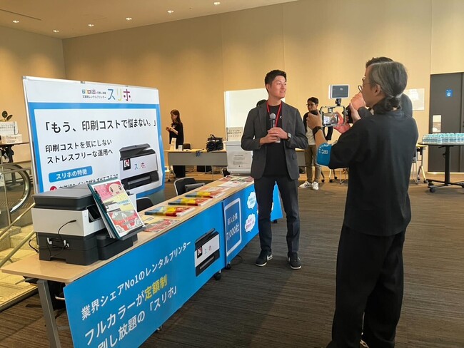 展示会では、教材システムなど教育DX関連の企業が多く並ぶ中、事務機器・プリンターレンタルを扱う出展はスリホのみ。