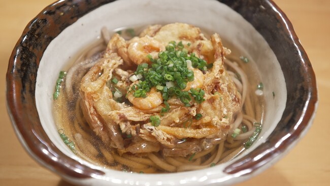 お店の看板メニュー「かき揚げそば」は塚地も初体験の味。