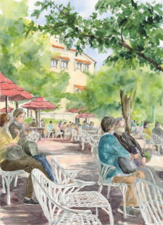 広い歌劇場中庭の奥行きのある構図を的確に写実され、開演を待つ人たちの表情もうまく捉えられています。画面上部の木の濃さと地面の影がいいバランスです。コロナ禍からやっと解放され久しぶりの観劇、その開演を待つ柔らかなひと時が伝わってきます。(井上 正三先生)