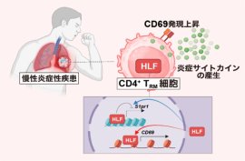 千葉大学大学院医学研究院 木内政宏助教と平原潔教授、横浜市立大学大学院医学研究科 呼吸器病学柳生洋行助教らの研究グループは、「組織常在性記憶CD4⁺T細胞(CD4⁺TRM細胞)」注1)が肺や腸などの組織に長期間とどまるメカニズムと、炎症性サイトカインの持続的な産生は、遺伝子の働きを調節するタンパク質である転写因子Hepatic Leukemia Factor(HLF)注2)によって制御されていることを新たに特定しました(図)。