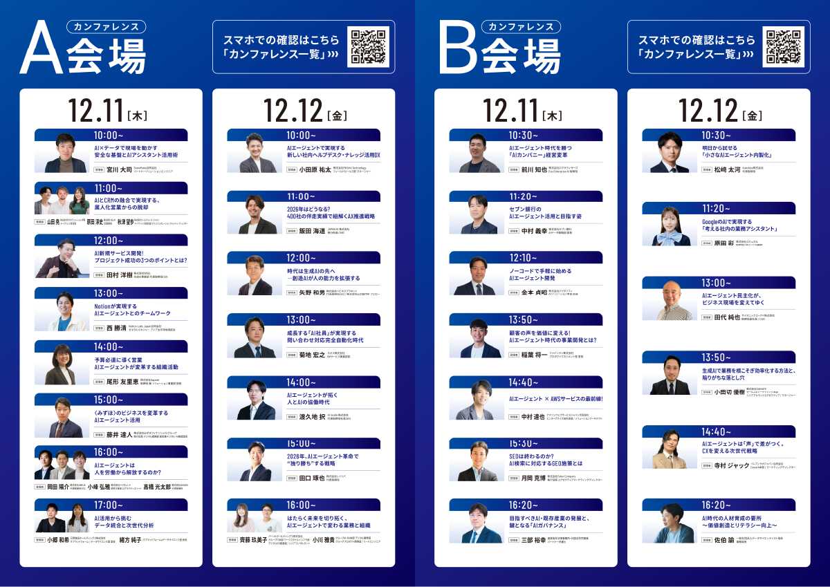 「AIエージェント博 by AI博覧会」は12月12日(金)が最終日となります。2日目も引き続き、最新ソリューションの展示デモが行われるほか、AIエージェントの具体的な活用事例や、ビジネスの現場に定着させるための実践的な方法など、明日のビジネスに直結する見逃せないセッションが多数予定されています。