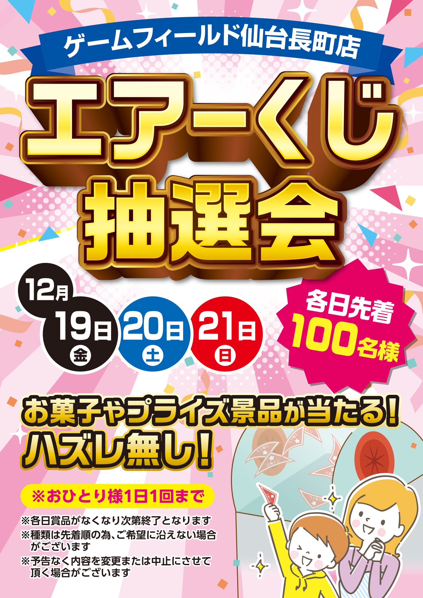 拡大オープンを記念して、12月19日(金)~21日(日)の3日間限定で、各日先着100名様を対象に、お菓子やプライズ景品が当たる「エアーくじ抽選会」を開催いたします。