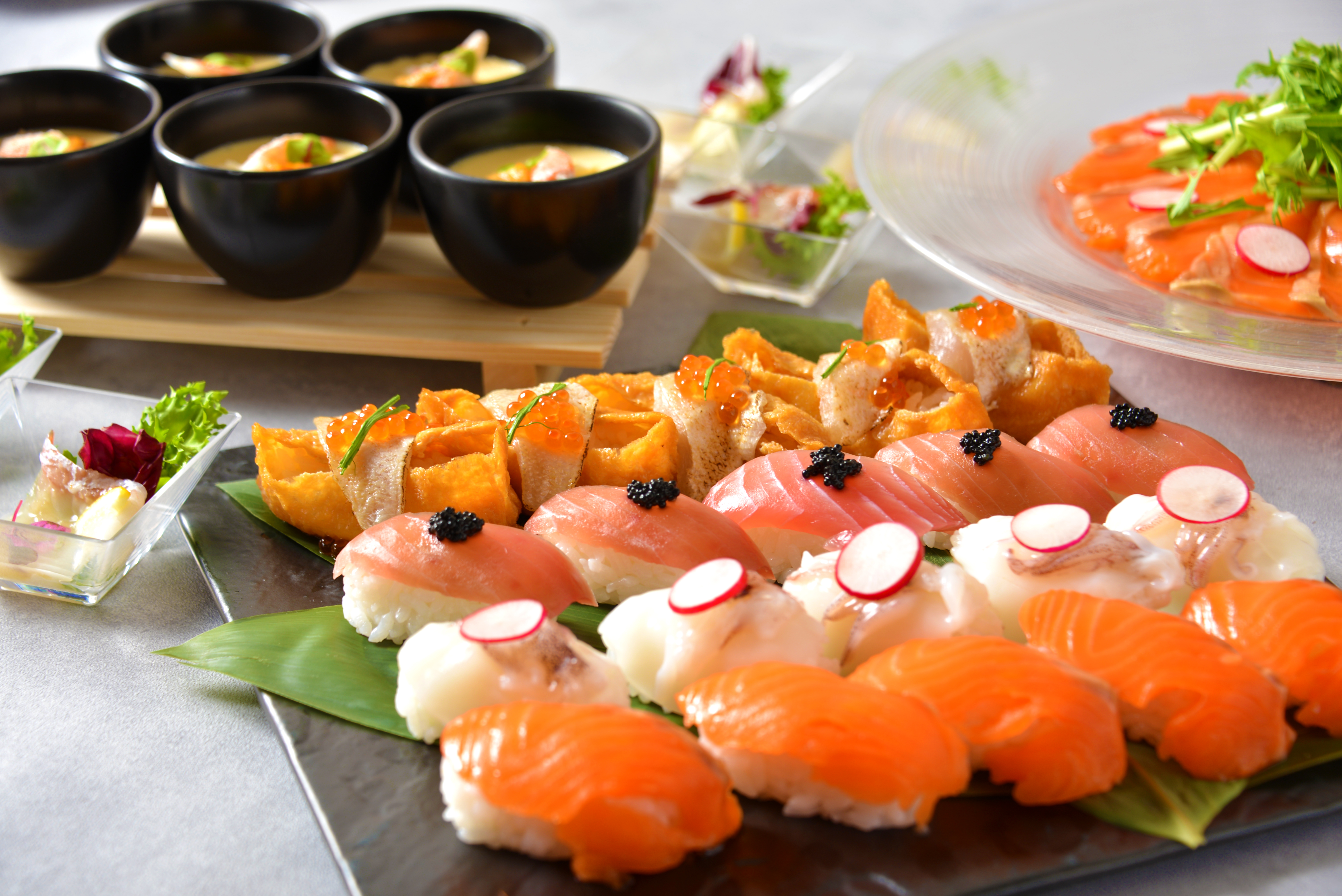 お客さまの目の前で調理し、熱々をお届けするライブキッチンに「黒毛和牛バーガー」が初登場いたします 。ジューシーな黒毛和牛の旨味を最大限に活かした、当ビュッフェでしか味わえない贅沢な一品です。その他にも、定番の「牛肉のステーキ」や、「寿司~飾りいなり寿司、鮪、トラウトサーモン~」もご用意し、食欲をかき立てます。